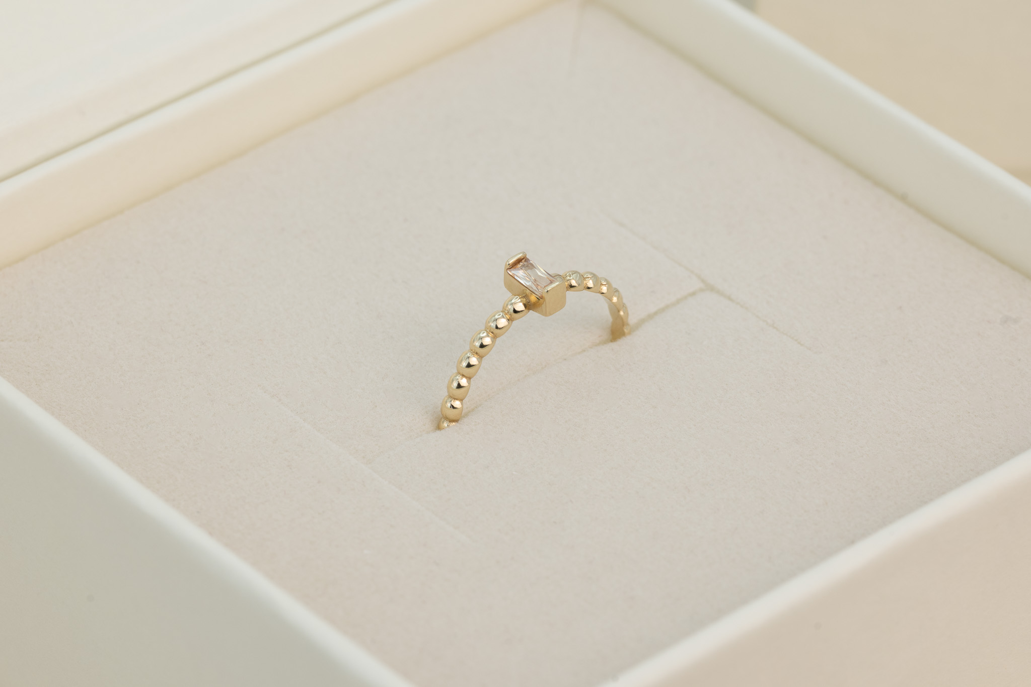 Die sanft schimmernden Goldkügelchen entlang der Ringschiene sorgen für einen raffinierten Look und lassen das Schmuckstück verspielt und stilvoll zugleich wirken. Liebevoll verpackt im hochwertigen Etui wird dieser Ring zu einem Geschenk, das in Erinnerung bleibt.