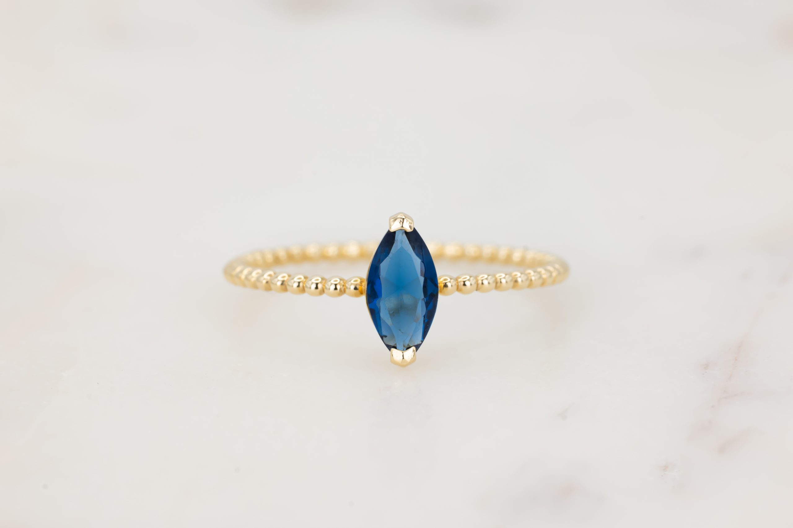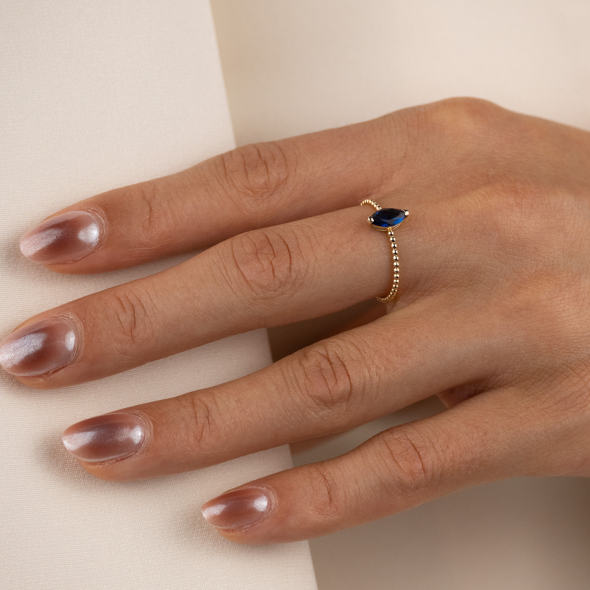 Dieser edle Damenring vereint zarte Eleganz mit einem Hauch von königlicher Tiefe. Der tiefblaue, marquiseförmige Zirkonia in Kombination mit der feinen, perlartigen Ringschiene wirkt anmutig und zugleich modern – ein echter Blickfang für jeden Anlass.